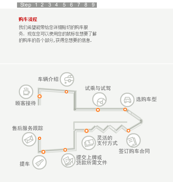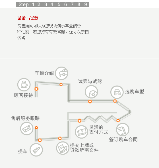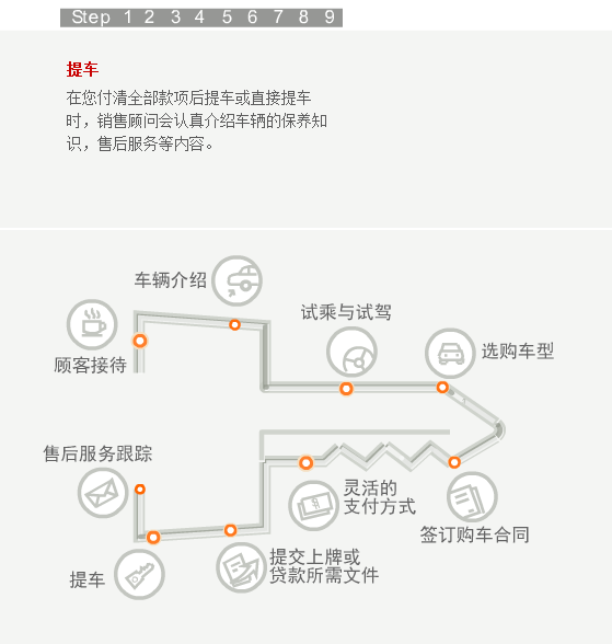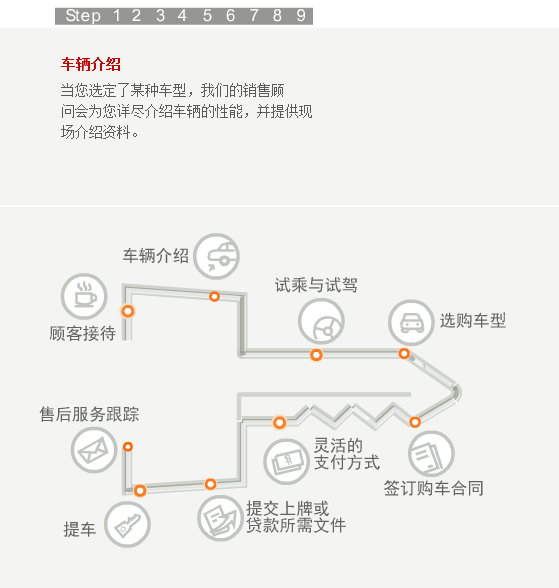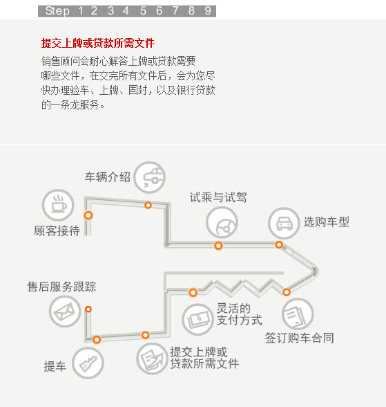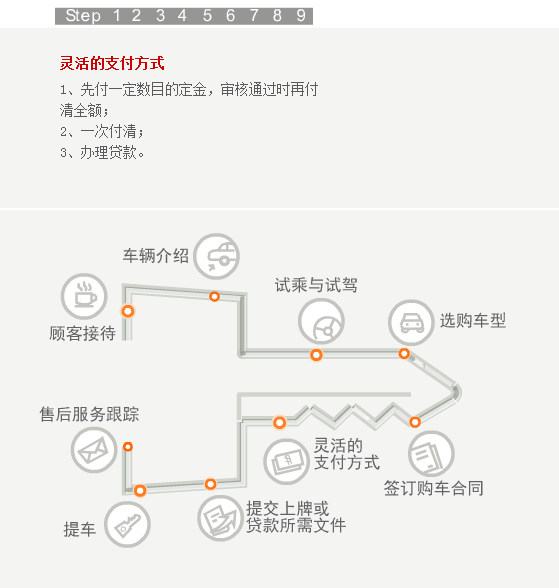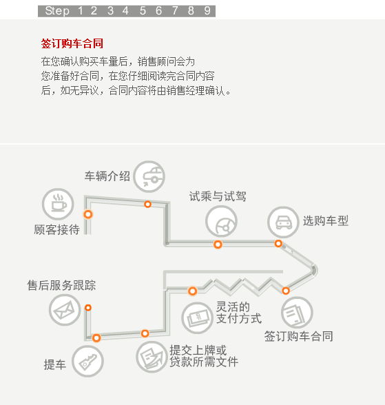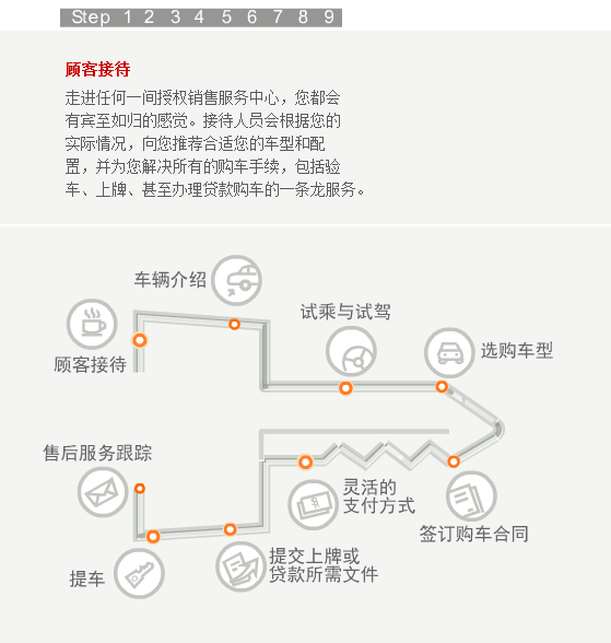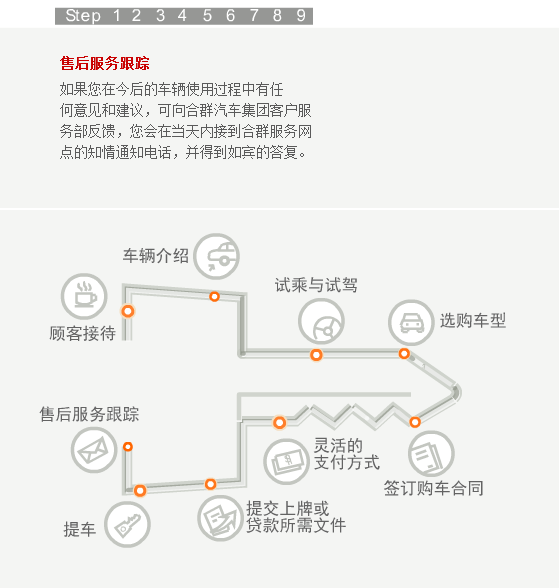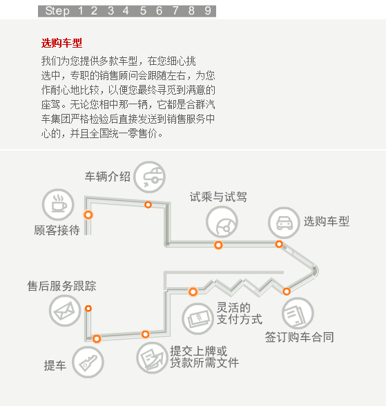 当您步入合群的任何一个展厅,都会有员工热情的上前接待您。如果您是来店看车,我们会马上安排经过严格培训的销售顾问为您讲解,为您的选车过程提供帮助。听完销售人员的介绍,您还可以亲自驾驶我们的试乘试驾车,感受一下有意向购买车型的各项性能。在您确定最终的购买的车型之后,销售顾问会请您在洽谈间入座,再为您设计一个最佳的购买方案,并确定车辆保险、装饰、一条龙上牌服务等具体的购买细节。然后,您可以选择最佳的付款方式,由财务部人员协助您完成付款过程。在此之后,我们的销售顾问和PDI人员会协助您在库房检验车辆。等到所有的手续办理完毕,您就可以提走属于自己爱车了。当然了,在车辆正式交付前,您的销售顾问还会向您介绍爱车的具体操作方法和使用常识,为您解读维修及索赔手册的内容、再次对车辆进行最后的检查、清洁美容并清点所有的随车工具和资料。在新车上路以后,我们依然会和您保持联系,通过电话回访等方式继续为您提供用车养车的咨询服务。这就是我们的顾问式销售全过程。
